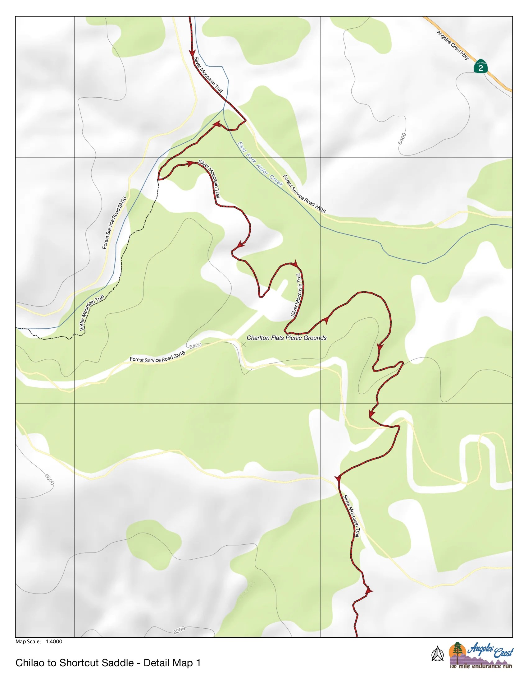 Runners cross the concrete wash and re-join the Silver Moccasin Trail via a left turn uphill. After 0.6 miles, a paved road is crossed, and runners follow single track South for another 0.8 miles, until dumping out on a fire road. You’ll turn left on this fire road and continue South for 1.2 miles to a T junction with another fire road. Again, you’ll bear left and after only 0.1 mile, turn right to get back on the single track as it crosses a creek bed. After following the single track for 0.3 miles, a hard left is taken at another junction, and runners traverse a winding single track for 0.6 miles to a hard right. Runners cross a road after 0.2 miles and proceed up another 0.2 to a final paved road crossing (Vetter Mountain Road) with views of the Shortcut Aid station 2.8 miles away and Mt. Wilson looming in the distance. From the road, it’s 2 miles of technical single track down to cross a creek bed, and then a relatively quick 500’, 0.8 mile climb up to the Shortcut Aid Station, mile 51.3, elevation 4,760’. You’re over halfway there!